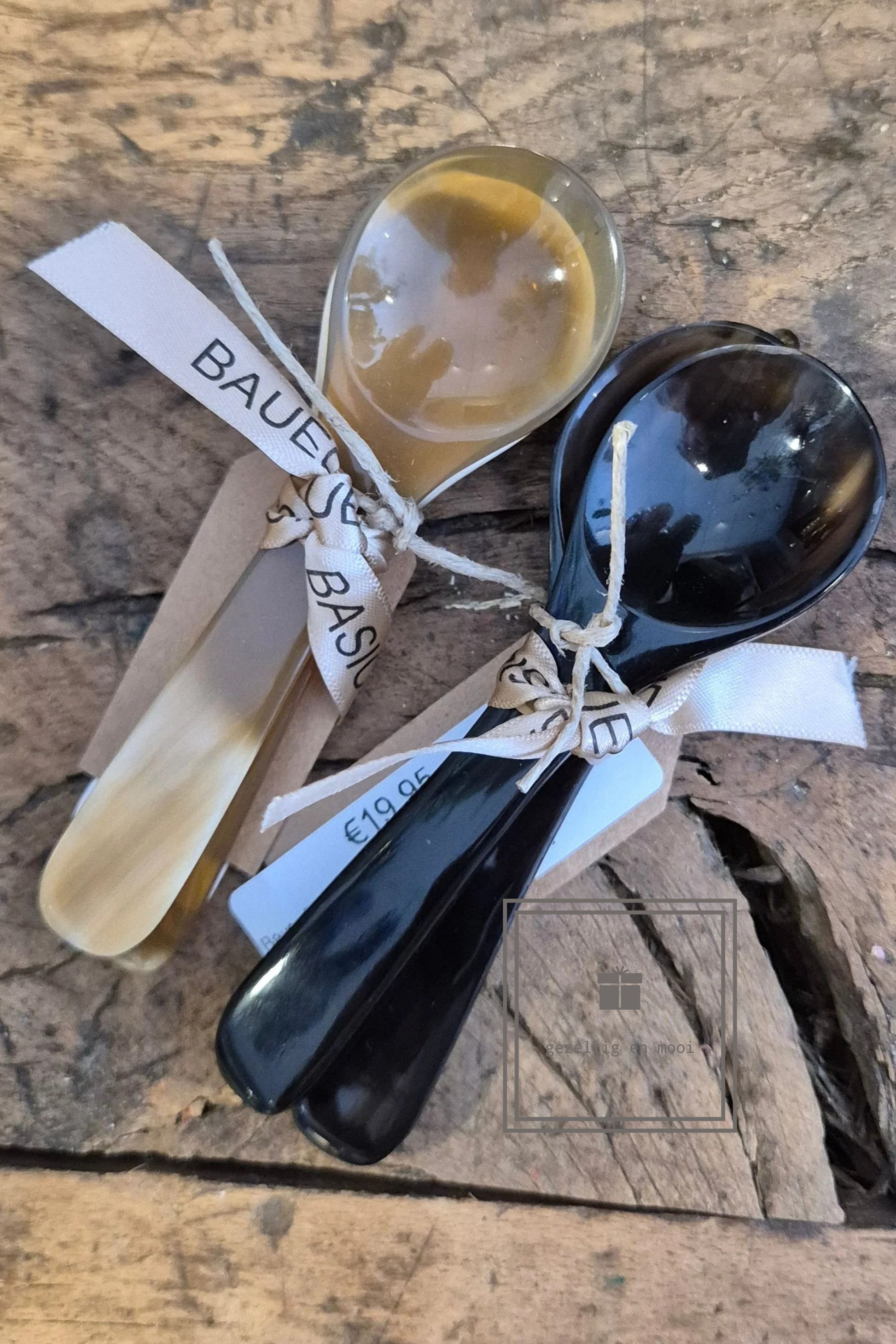 Maak je borrelplank compleet met dit stijlvolle, handgemaakte lepeltje van buffelhoorn. Ideaal voor het serveren van tapas, olijven, chutneys, mosterd of andere fijne dips. Elk lepeltje is uniek, met natuurlijke kleurvariaties die warmte en karakter aan je tafel geven.