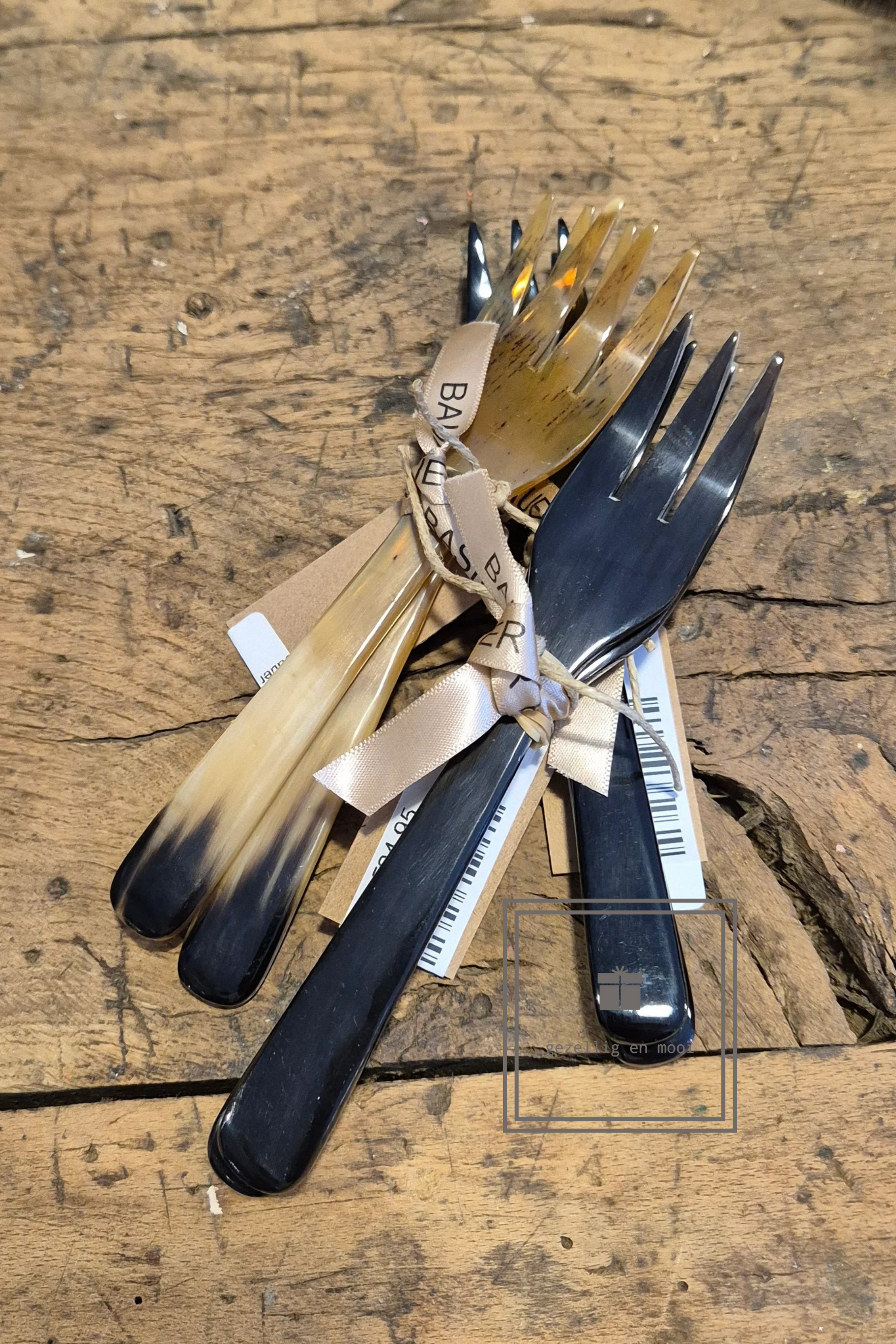 Serveer kleine hapjes met stijl met dit verfijnde tapasvorkje van buffelhoorn. Perfect voor olijven, kaasblokjes, charcuterie of andere borrelhapjes. Elk vorkje is met de hand gemaakt en uniek in kleur, tekening en uitstraling – een subtiel detail dat uw borrelmoment bijzonder maakt.