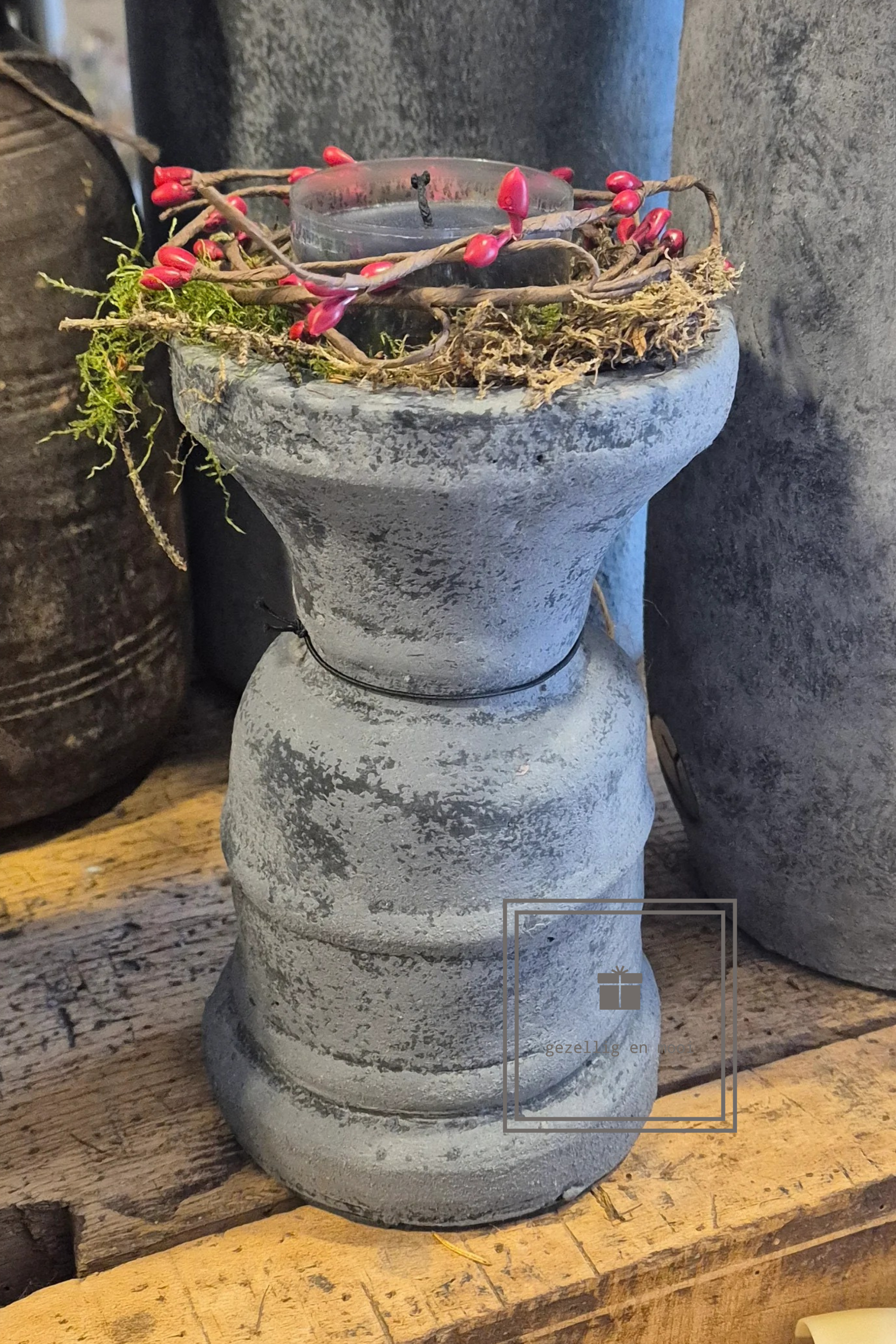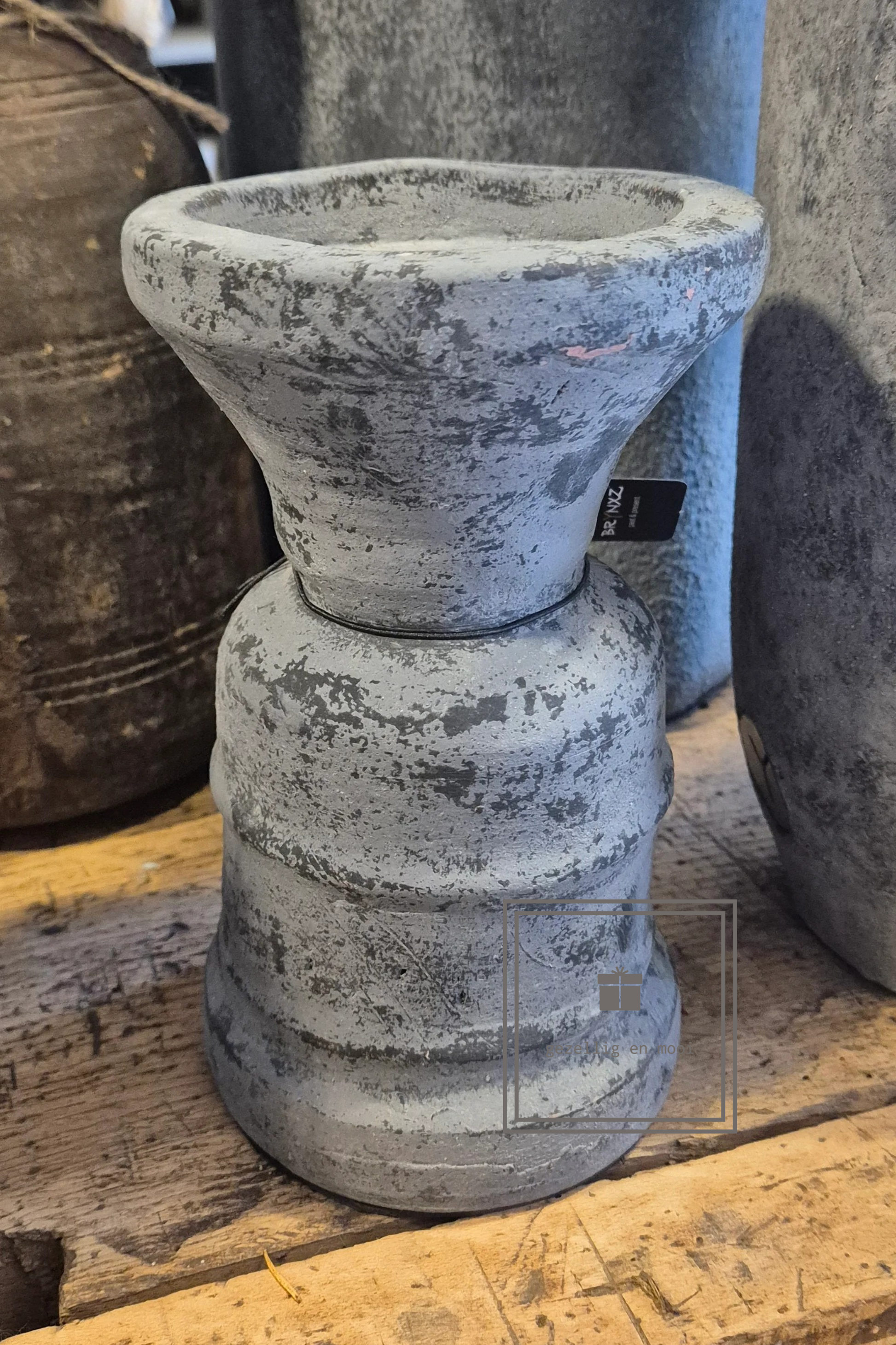 Deze prachtige grijze kandelaar brengt warmte en gezelligheid in huis. Met zijn mooie stoere tint en elegante vorm past hij in ieder interieur en geeft hij direct een knusse sfeer, of je hem nu op tafel, de vensterbank of een dressoir plaatst.
