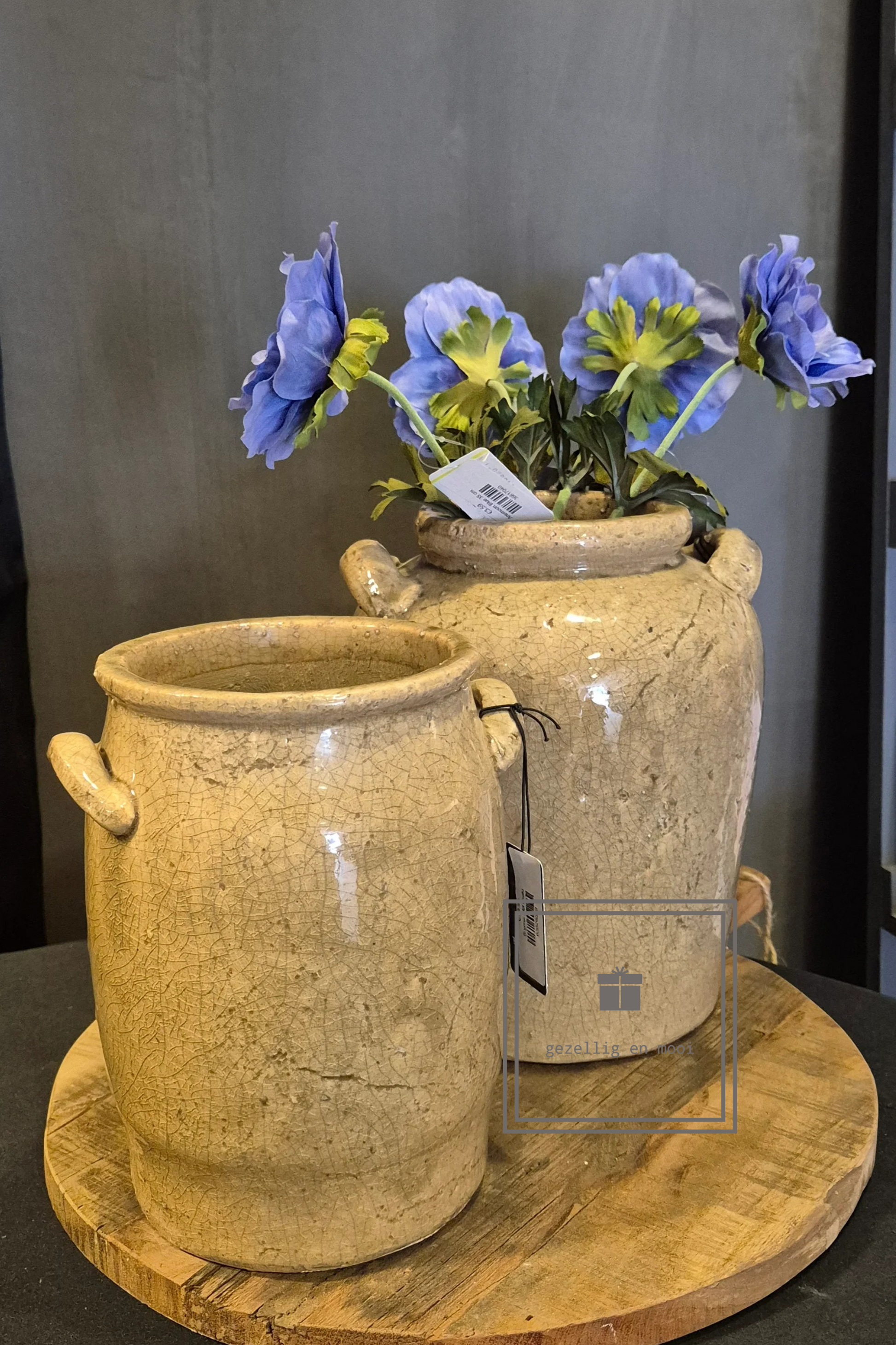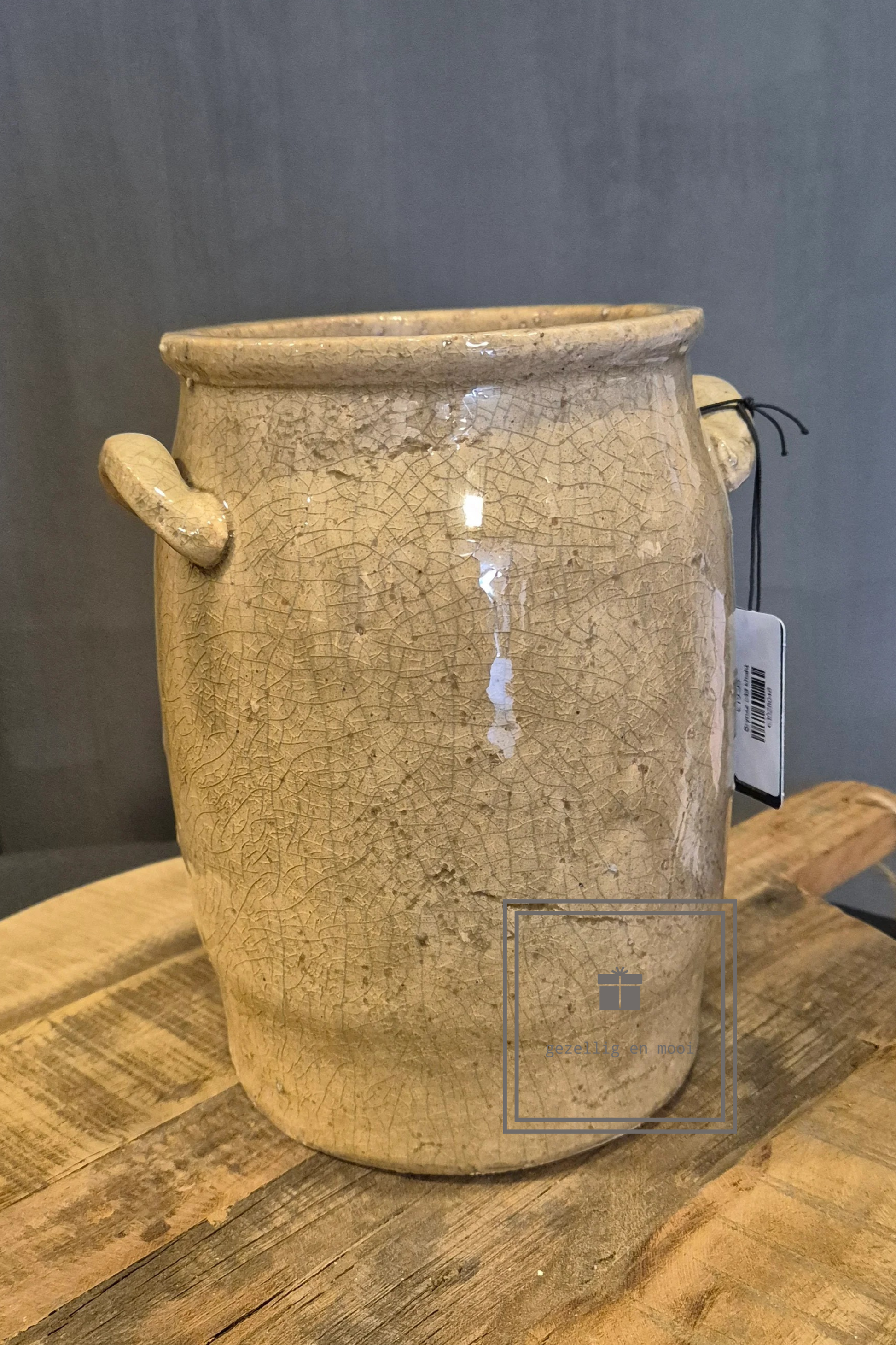Afmeting: 20 cm hoog en de opening bovenkant diameter 12 cm.