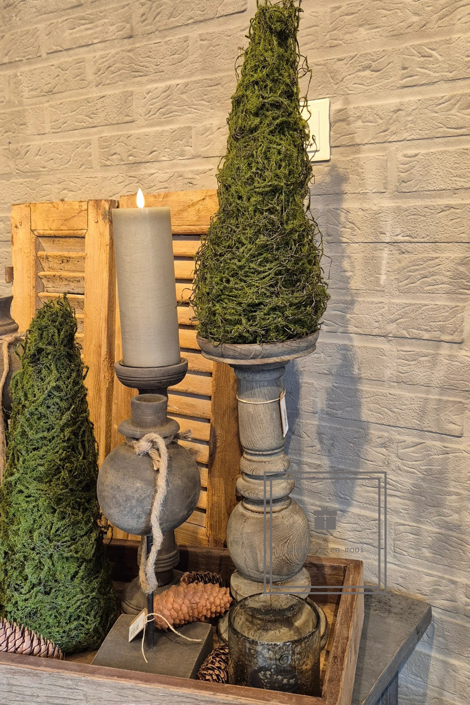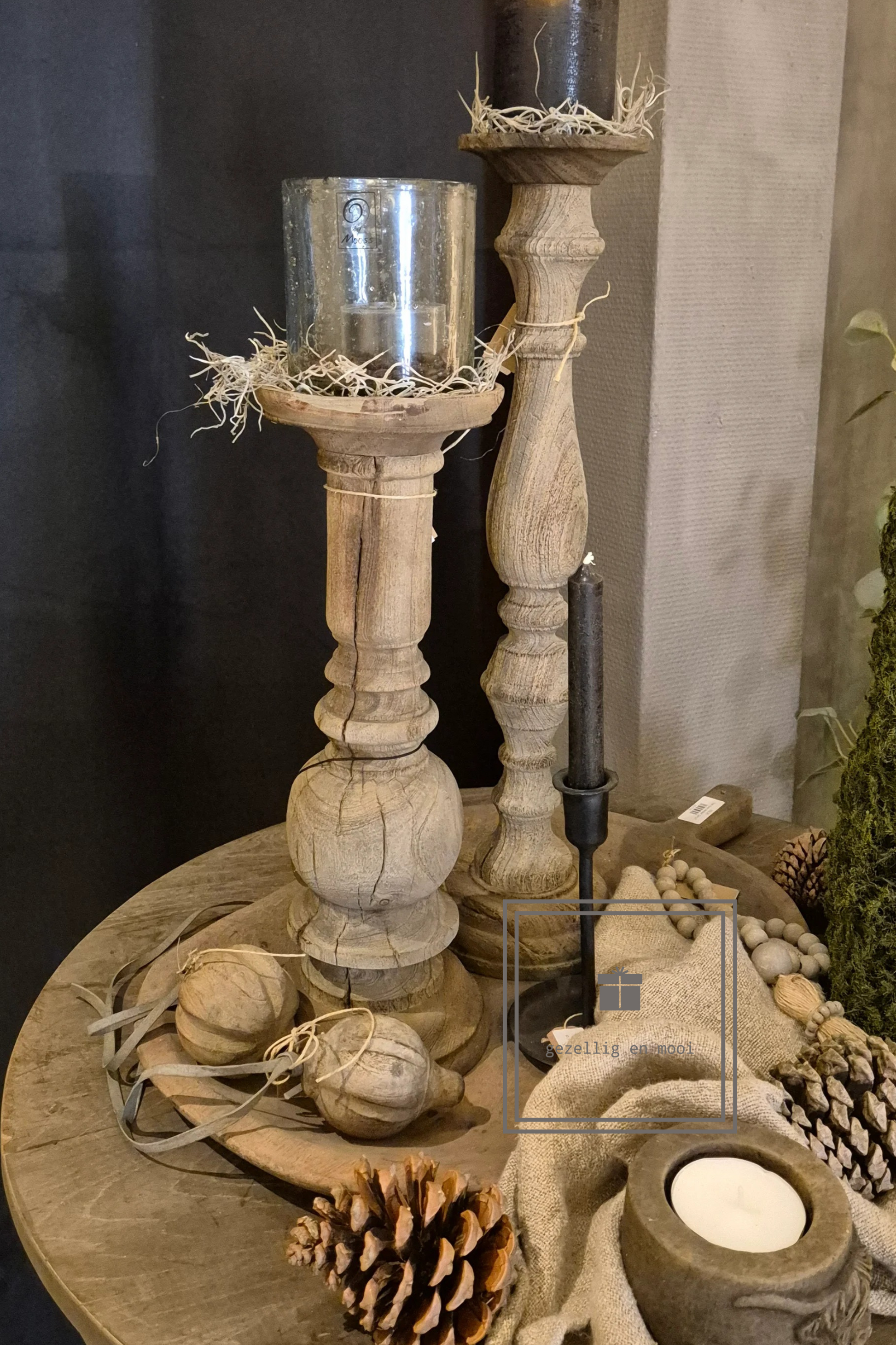 De robuuste vorm en het doorleefde hout zorgen voor een tijdloze charme die perfect past in zowel landelijke als industriële interieurs. Of je hem nu plaatst op een dressoir, eettafel of in een knusse hoek – deze kandelaar trekt direct de aandacht en zorgt voor een warme, sfeervolle gloed.