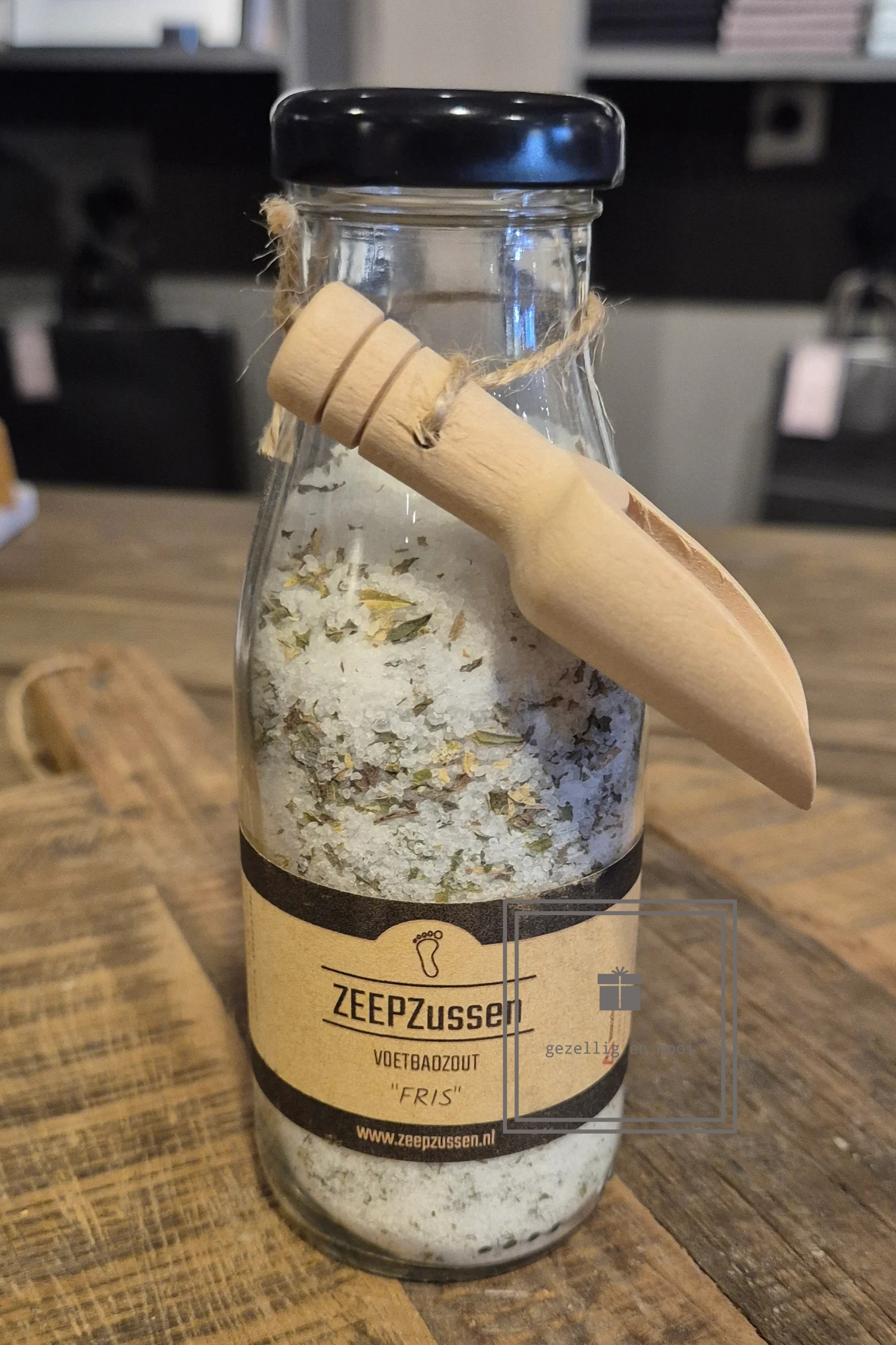 Een heerlijk Frisse voeten badzout met houten schepje.